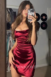 FannyWe Elegant Burgundy Straps Scoop Pleated Satin Short Homecoming Party Dress formal wear dresses