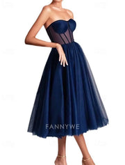FannyWe Simple A-Line Prom Dresses Party Dress Evening Party Cocktail Party Tea Length Sleeveless Sweetheart Tulle with Ruched