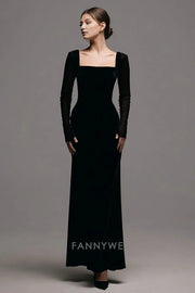 FannyWe Simple Black Velvet Square Neck Sheath Long Holiday Party Dress with Sleeves