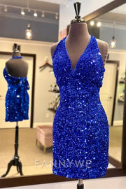 FannyWe Simple Royal Blue Sequin Halter Tie-Back Short Homecoming Dress formal wear dresses