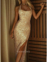 FannyWe Simple Women's Sequin Dress Prom Dress Party Dress Sequins Split Halter Neck Sleeveless Birthday Vacation Gold Summer Spring - US 2 / UK 6 / EU 32