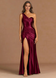 Step into bold elegance with Fannywe's one-shoulder satin lace-up back high-slit mermaid maxi dress. The draped one-shoulder neckline, tailored ruching, and deep burgundy satin fabric create a sleek, alluring silhouette, while the high slit and lace-up back add dynamic charm. The rich hue offers a timeless, formal fit—ideal for evening galas, wedding receptions, or upscale soirees. The lustrous satin material further elevates its appeal, ensuring you exude confidence at any polished occasion.