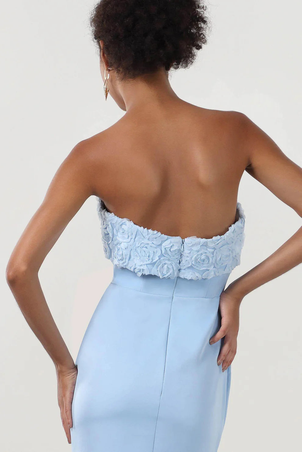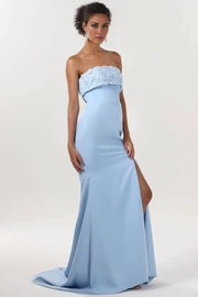 Step into soft elegance with Fannywe's strapless floral-embellished satin mermaid maxi dress. The delicate sky-blue satin fabric, 3D floral-bodice detail, and flowing mermaid skirt create a romantic, polished silhouette. The thigh-high slit adds subtle allure, making it ideal for spring weddings, garden galas, or upscale daytime events. The lustrous satin material exudes grace, ensuring you shine at any refined occasion.
