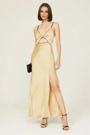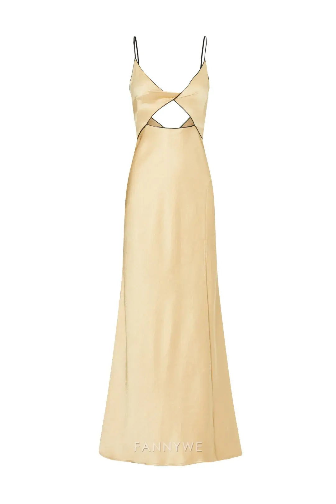 Step into elegance with Fannywe's spaghetti strap cutout slit satin sheath maxi dress. The delicate spaghetti straps, paired with front + back cutout details and glossy satin fabric, highlight your silhouette beautifully, while the high slit adds layers of sophistication and allure. The soft champagne hue creates a stunning, glamorous fit, perfect for upscale events or evening gatherings. The contrasting black piping further elevates its appeal, ensuring you exude modern luxury at any sophisticated occasion.