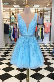 V neck tulle lace applique short prom dress