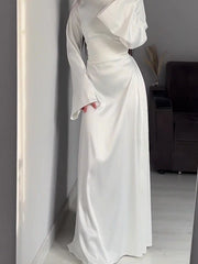 Step into sleek elegance with Fannywe's long-sleeve lace-up back satin maxi dress. The smooth white satin fabric, flowing bell sleeves, and adjustable lace-up back create a refined, versatile silhouette. The wrap-style bodice and floor-length skirt add graceful movement, making it ideal for formal dinners, evening receptions, or upscale semi-formal events. The lustrous satin material exudes timeless charm, ensuring a polished look at any refined occasion.