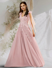 A-Line Beautiful Back Floral Open Back Engagement Prom Dress V Neck Backless Sleeveless Floor Length Tulle with Bow(s) Appliques