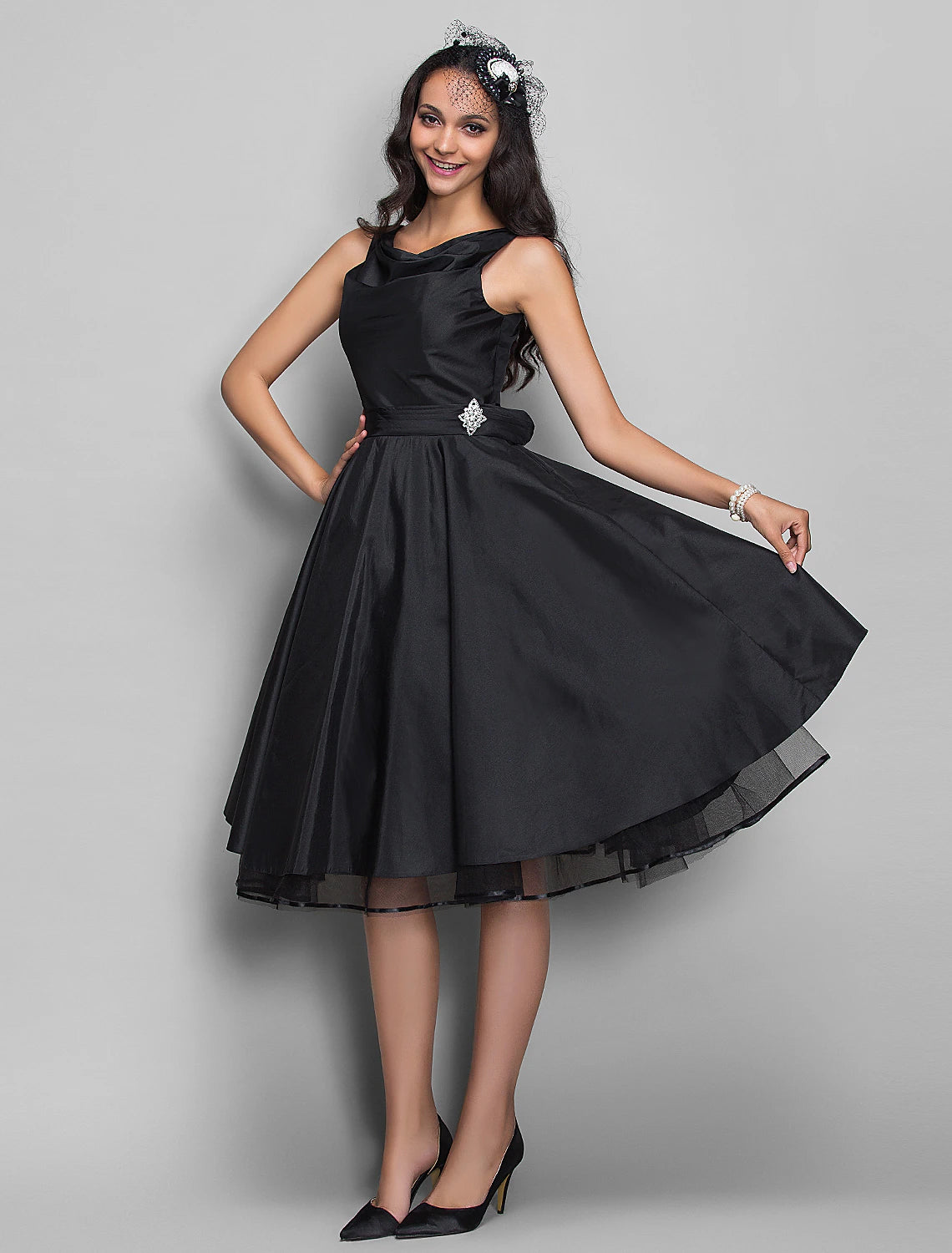A-Line Cocktail Black Dress Vintage Dress Halloween Wedding Guest Knee Length Sleeveless V Neck Taffeta with Pleats Crystals