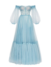 A-Line Elegant Sexy Wedding Guest Prom Dress Off Shoulder Long Sleeve Floor Length Tulle with Bow(s) Pleats - Dusty Blue / US 2 / UK 6 / EU 32