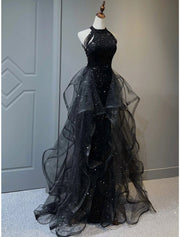 A-Line Prom Black Dress Vintage Dress Wedding Party Birthday Sweep / Brush Train Sleeveless Halter Neck Wednesday Addams Family Sequined with Crystals Sequin Ruffles - US 2 / UK 6 / EU 32