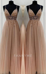 A-Linie/Elegant Spaghettiträger Ärmellos Perlenbesetzt Tüll Bodenlang Abendkleider Brautjungfernkleider Abendkleid Ballkleid Mit Schlitz