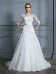 A-Linie/Princess-Linie 1/2 Ärmel U-Ausschnitt Spitze Hof-schleppe Tüll Brautkleider