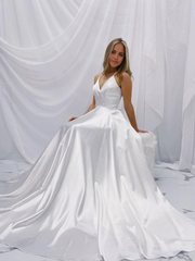 A-Linie, schlicht, V-Ausschnitt, weißer Satin, lange Ballkleider, rückenfrei, lange formelle Abendkleider, Brautkleider - US 2 / UK 6 / EU 32