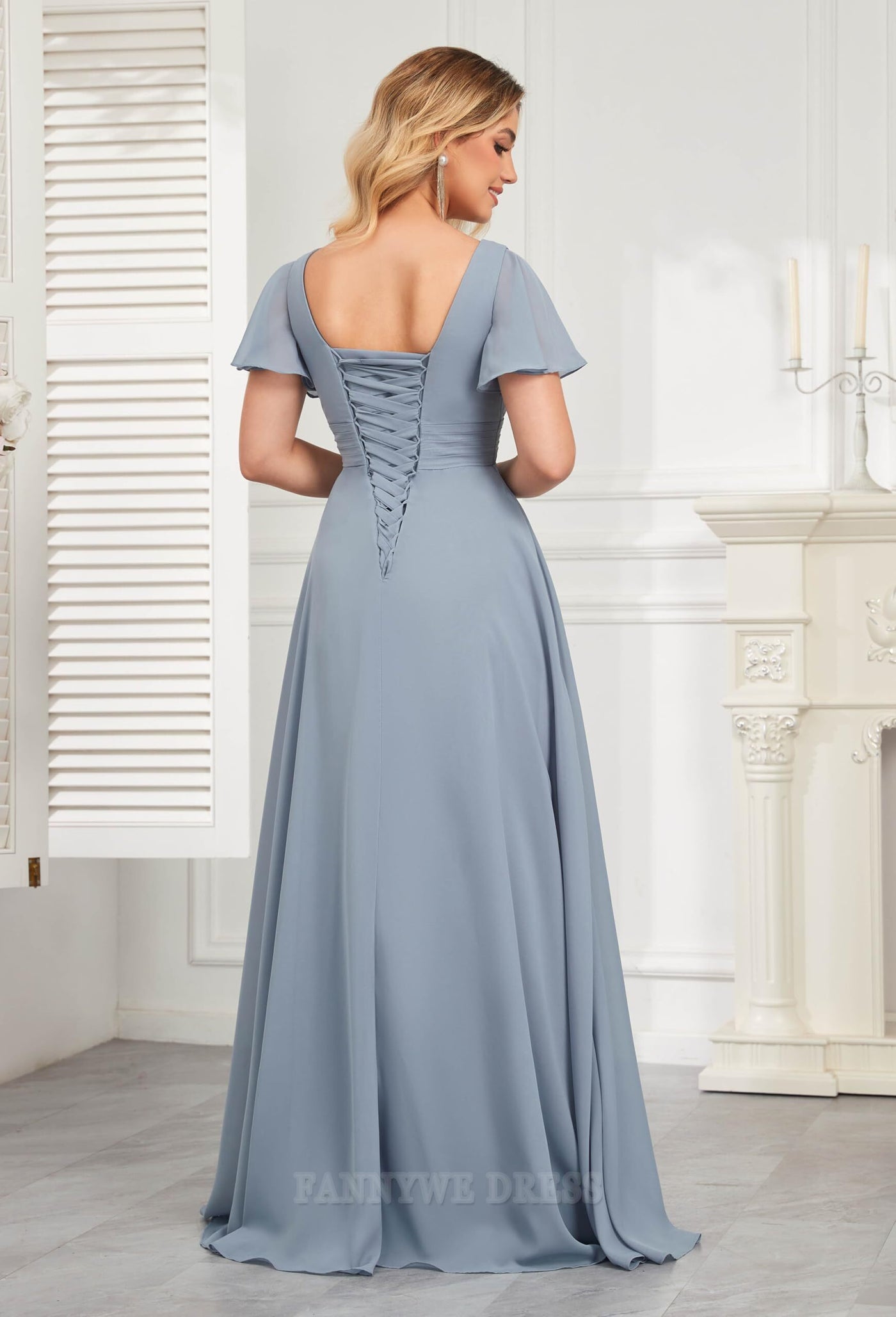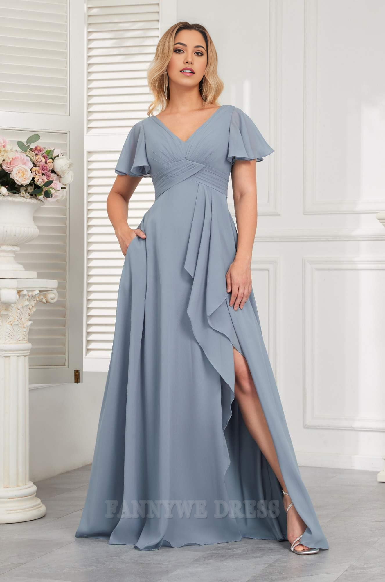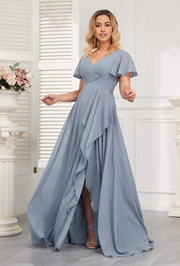 A-Linie V-Ausschnitt Flatterärmel Chiffon Abendkleider Brautjungfernkleider Abendkleid Ballkleid mit Seitenschlitz