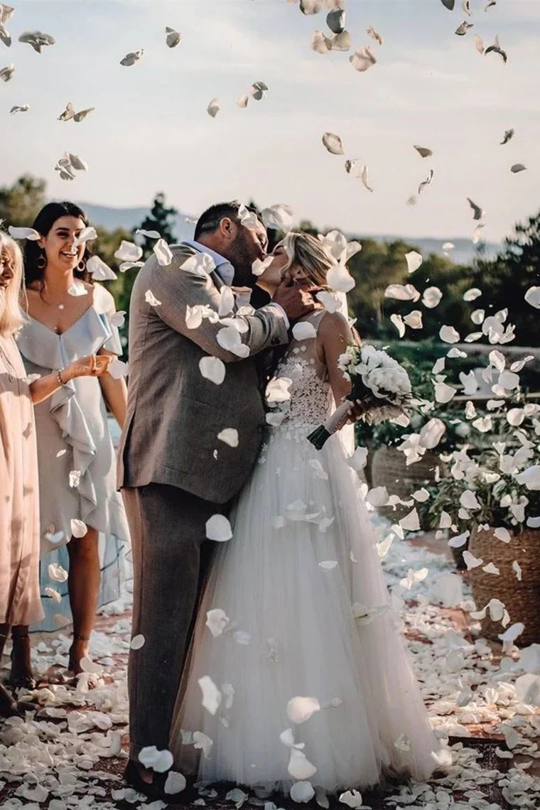Strand A-Linie Elegant V-Ausschnitt Blumen V-Rücken Tüll Brautkleider Ballkleid Brautkleider - US 2 / UK 6 / EU 32