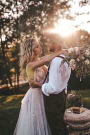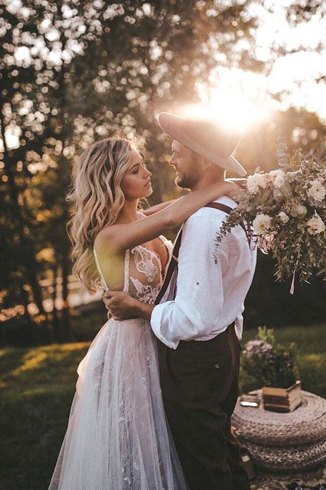 Strand A-Linie V-Ausschnitt Tüll Perlen Spitze Brautkleider Brautkleider mit Applikationen