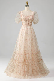 Champagnerfarbenes A-Linien-Ballkleid mit Blumenmuster, Plissierung und Stufen und Puffärmeln