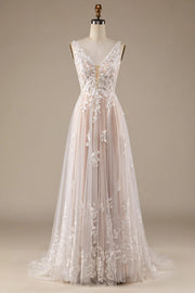 Champagnerfarbenes rückenfreies Tüll-Brautkleid mit V-Ausschnitt und Spitze