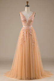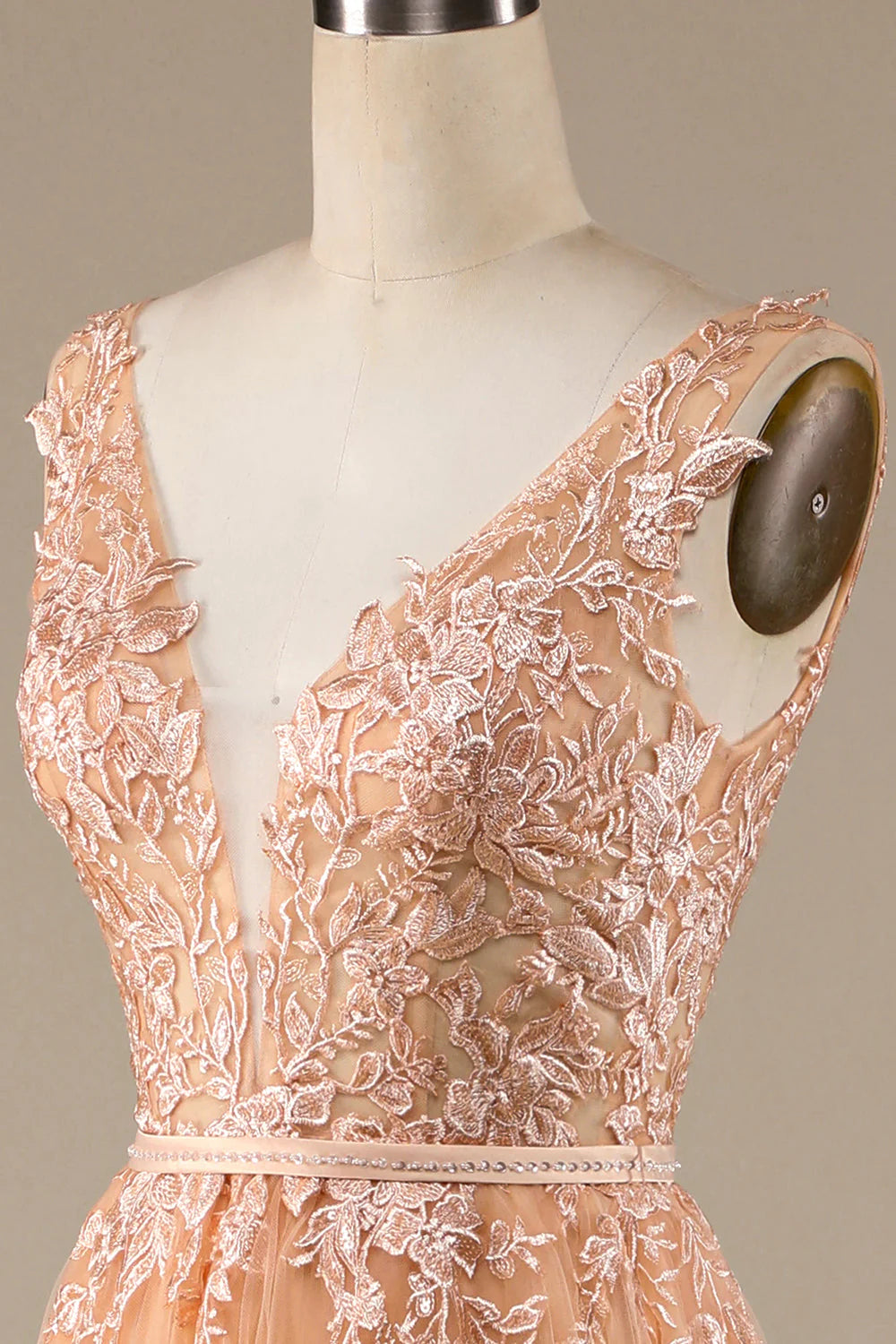 Champagnerfarbenes Tüll-Brautkleid mit V-Ausschnitt und Spitze