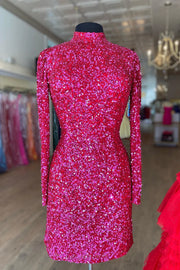 Fuchsiafarbenes, figurbetontes, langärmliges Homecoming-Kleid mit Pailletten