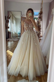 Wunderschönes Champagner-Ballkleid in A-Linie mit Spaghettiträgern und Applikationen