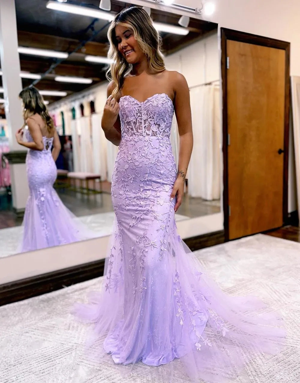 Meerjungfrau-Ballkleid mit trägerlosem Korsett-Rücken und Applikationen