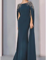 Meerjungfrau/Trompete Kleid für die Brautmutter, Hochzeitsgast, elegant, U-Ausschnitt, Sweep/Pinselzug, Stretch-Chiffon, lange Ärmel mit Paillettenrüschen