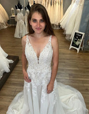 Hübsches A-Linien-Brautkleid aus Tüll mit V-Ausschnitt, Applikationen und Perlen