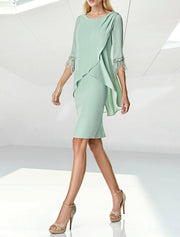 Etuikleid/Säulenkleid, Cocktailkleid, elegantes Kleid, Partykleidung, Hochzeitsfeier, knielang, 3/4-Ärmel, Rundhalsausschnitt, Herbst, Hochzeitsgast, Chiffon mit Federrüschen