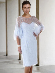 Etuikleid/Säulenkleid für die Mutter der Braut, Herbst, Hochzeitsgast, funkelnd und glänzend, elegant, Rundhalsausschnitt, knielang, Stretch-Chiffon, halbe Ärmel, mit Federn, Perlen, Pailletten