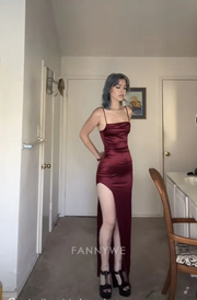 Etuikleid Spaghettiträger Satin Weinrot Lange Abendkleider Brautjungfernkleider Abendkleid Ballkleid
