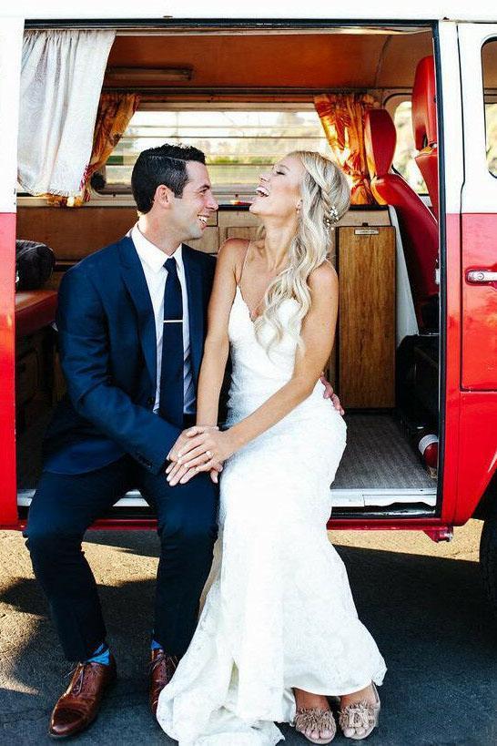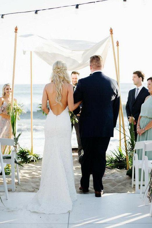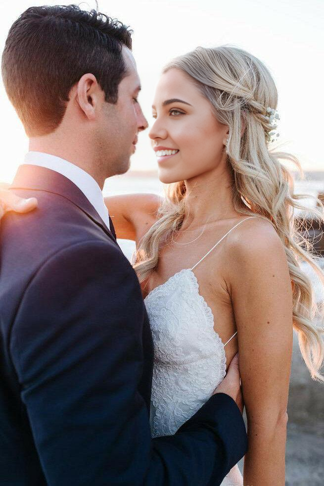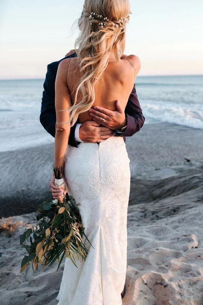 Spaghetti-Strand-Träger V-Ausschnitt Spitze rückenfreies Brautkleid Brautkleider