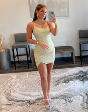 Spaghettiträger-Abendkleid mit Schlitz und Perlen