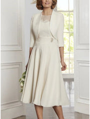 Zweiteiliges A-Linien-Kleid für die Brautmutter, elegant, Party, U-Ausschnitt, knielang, Spitze, Stretch-Chiffon, 3/4-Ärmel mit Falten und Kristallen