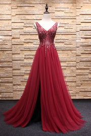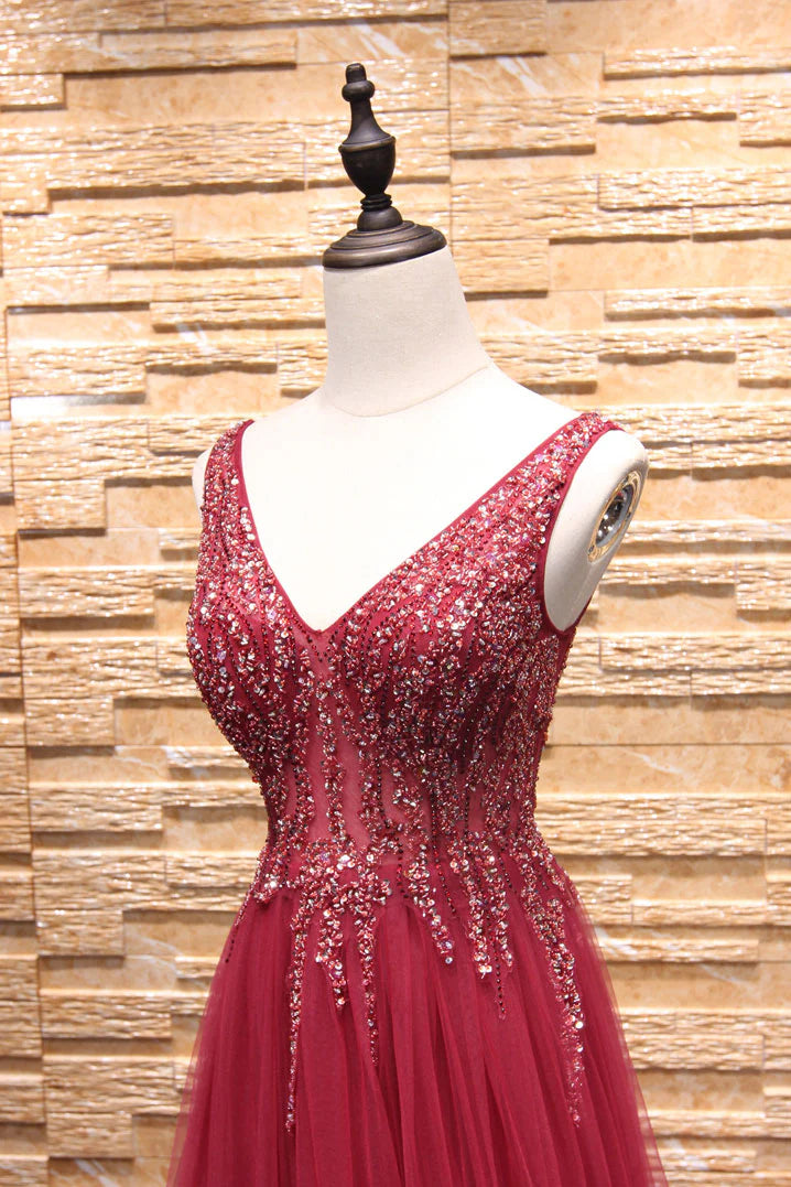 Langes Ballkleid aus Tüll mit V-Ausschnitt und Perlen