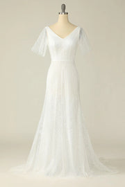 Weißes Brautkleid aus Spitze mit V-Ausschnitt