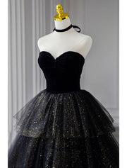 A-Linie Ballkleider Schwarzes Kleid Formales Geburtstagskleid Bodenlang Ärmellos Trägerlos Tüll mit gerüschten Pailletten
