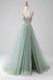 A-Linien-Ballkleid in Hellgrün mit Perlen und Schlitz