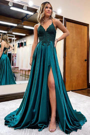 Langes A-Linien-Ballkleid aus Satin mit Schlitz - Dunkelgrün / US 2 / UK 6 / EU 32
