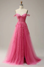A-Linie, schulterfrei, langes, pinkfarbenes Ballkleid mit Applikationen