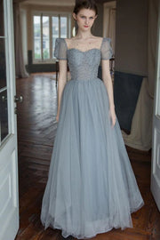 Langes graues Ballkleid in A-Linie mit quadratischem Ausschnitt und Perlenbesatz