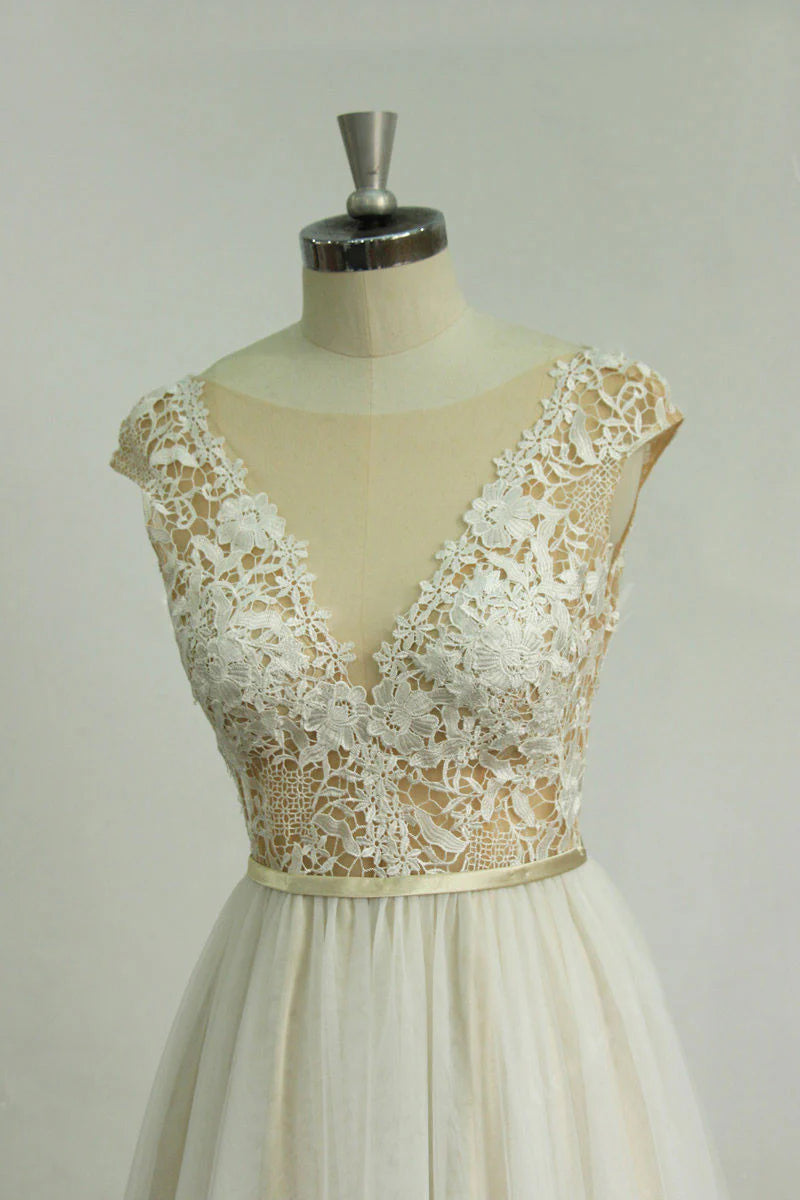 Langes A-Linien-Ballkleid aus Spitze mit Rundhalsausschnitt