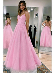 Ballkleid A-Linie Ballkleider Glitzerndes Kleid Formeller Abschlussball Bodenlang Ärmellos V-Ausschnitt Tüll Rückenfrei mit Falten