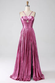 Fuchsia A-Linie Spaghettiträger Plissee Ballkleid mit Schlitz