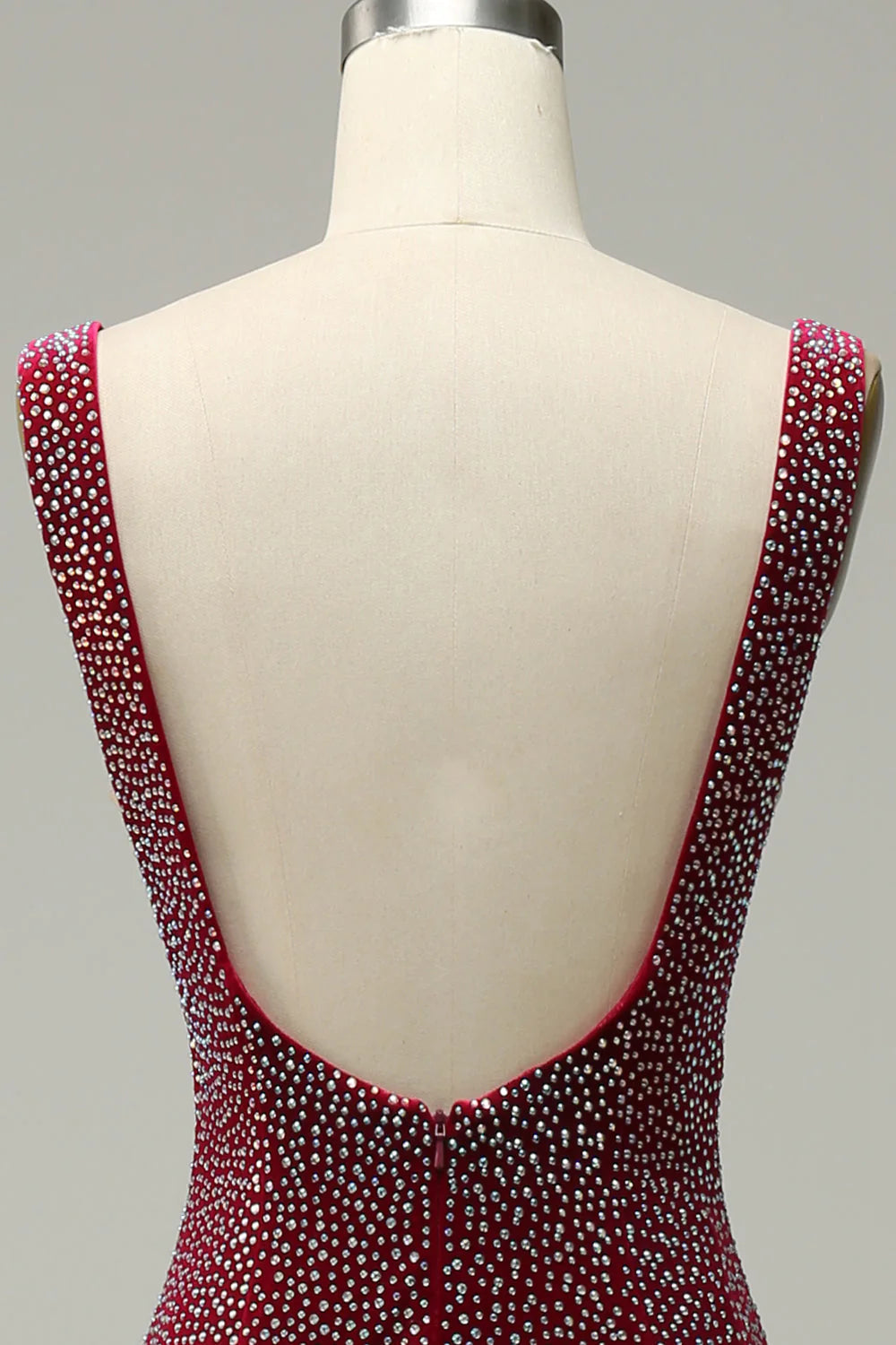 Burgunderrotes langes Ballkleid im Meerjungfrauen-Stil mit tiefem V-Ausschnitt und Perlen