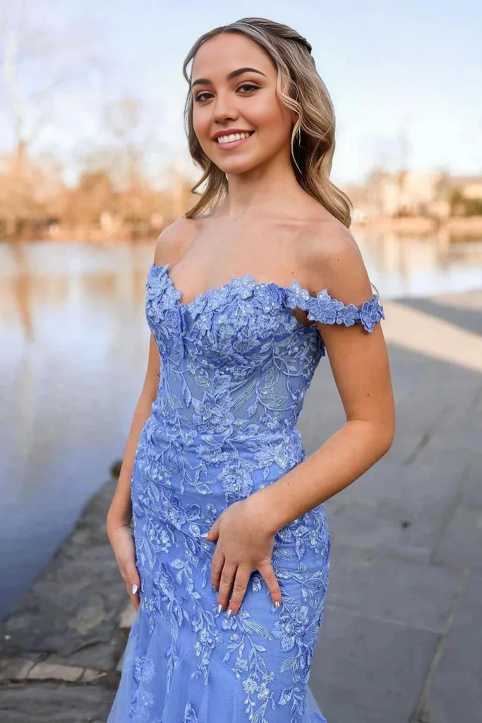 Meerjungfrau Off The Shoulder Blaue Spitze Lange Ballkleider Formelle Abendkleider