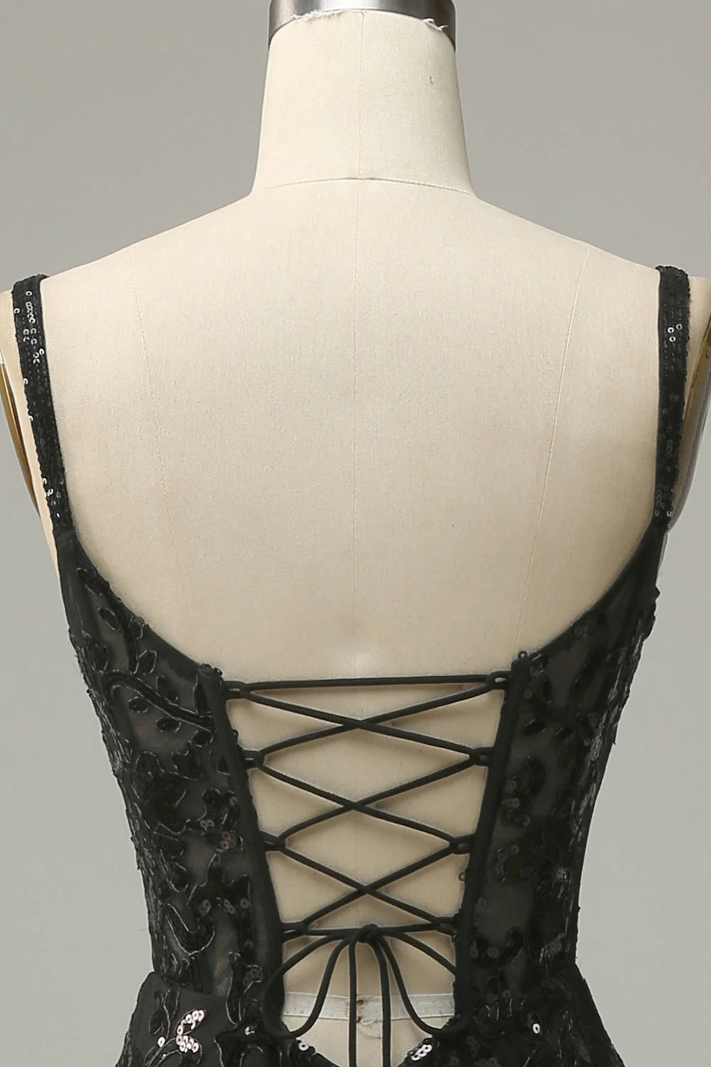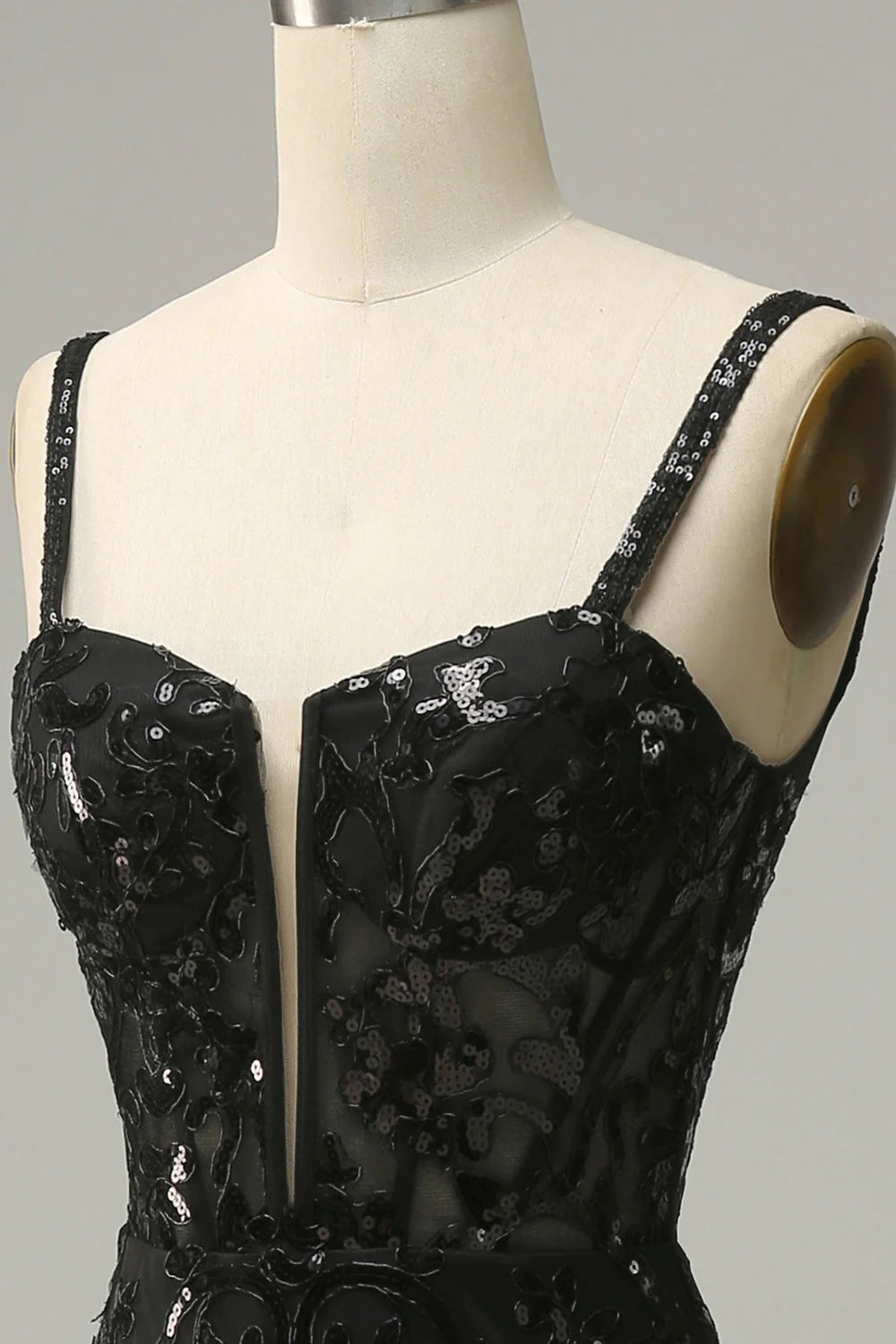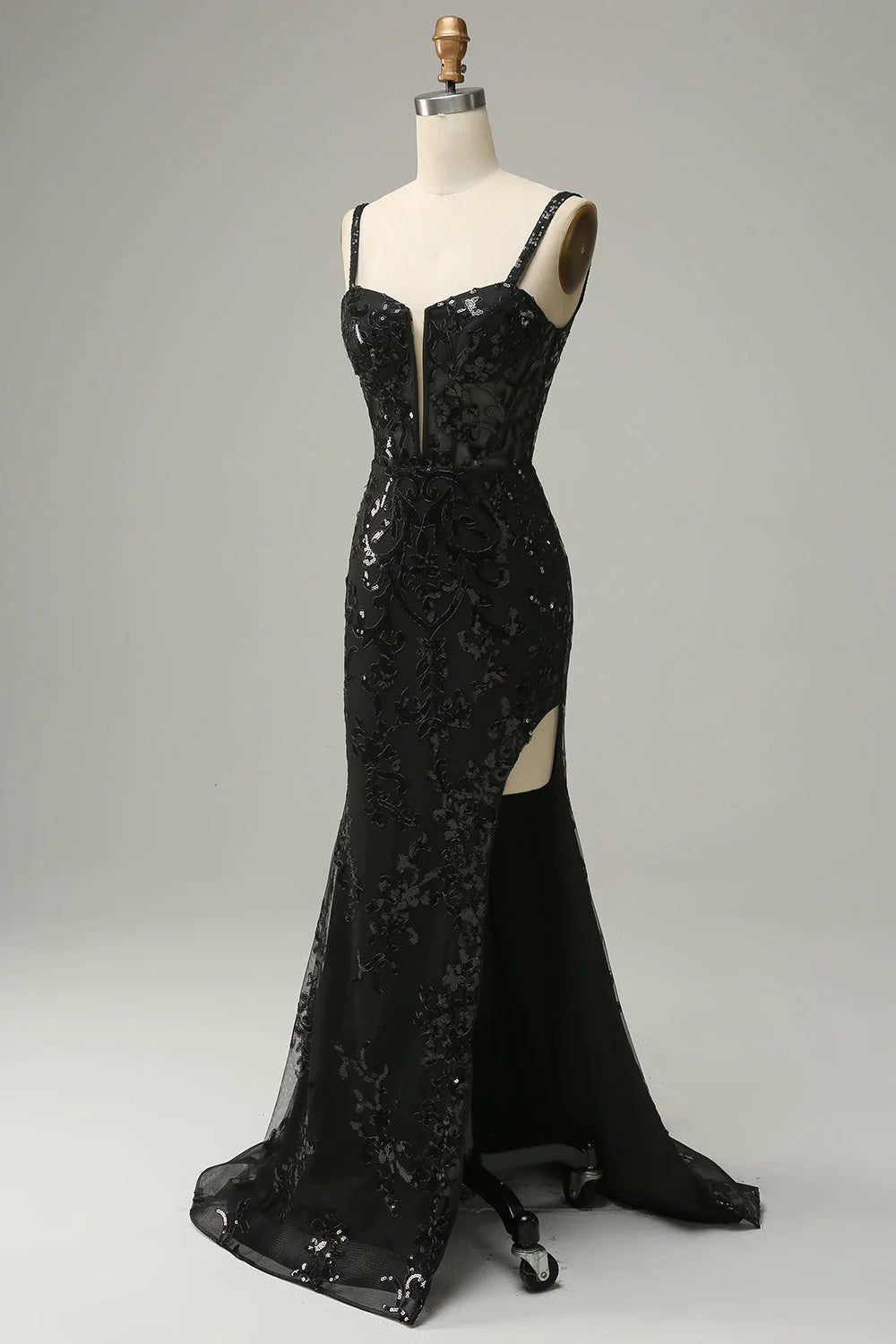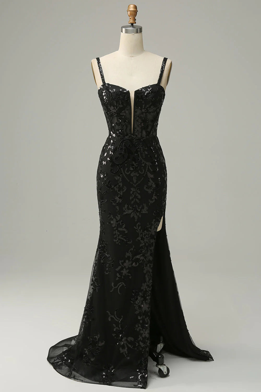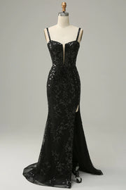 Meerjungfrau-Abschlussballkleid mit Spaghettiträgern und schwarzen Pailletten und Schlitz vorne