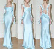 Meerjungfrau Träger Satin Blau Lange Abendkleider Brautjungfernkleider Abendkleid Ballkleid