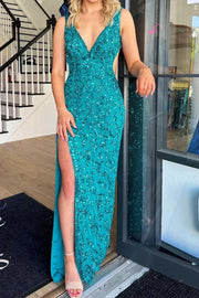 Meerjungfrau-Abschlussballkleid mit V-Ausschnitt und Pfauenpailletten, langes rückenfreies