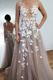 Langes Ballkleid aus Spitzentüll mit Rundhalsausschnitt